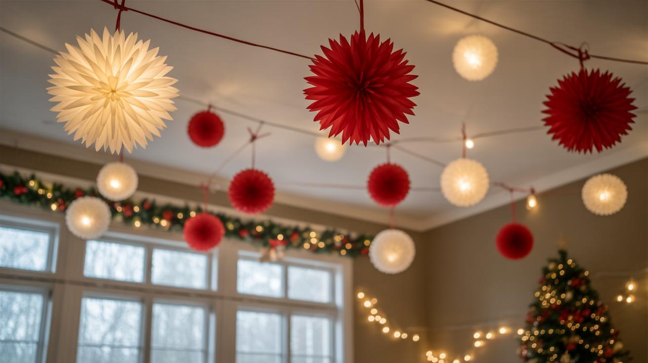 Go playful with pom-pom garlands strung across the ceiling. Choose traditional Christmas colors or mix in pastel tones for something more whimsical.