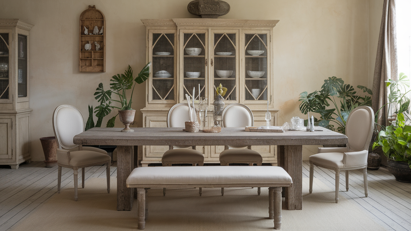 Neutral tones are the backbone of French country dining rooms. Think warm creams, taupes, soft greys, and gentle whites.