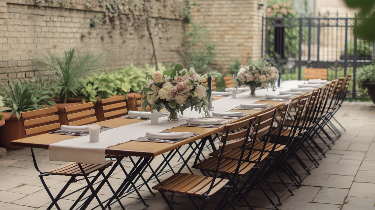 Who says picnic tables are only for parks? A modern picnic table setup—long bench seating with a sturdy wooden or metal base—feels casual and fun.