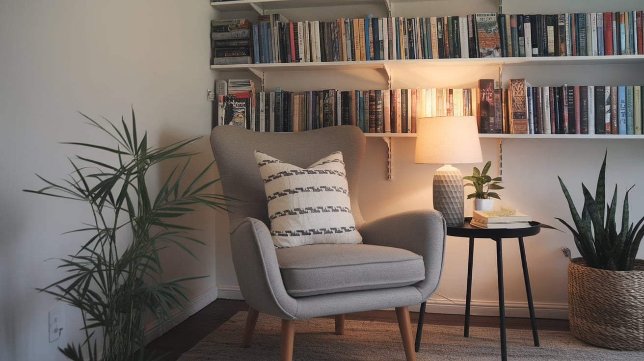 Not into clutter? Keep it sleek with just a modern chair, a lamp, and a small side table. Sometimes less really is more.
